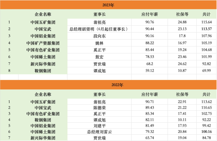 在应付年薪方面,8家钢铁、矿业央企董事长或总经理2024年的薪资均未超过100万元,若算上社保、企业年金、补充医疗保险及住房公积金等单位缴存部分,这几家央企董事长税前年薪总额最高的为110万左右。