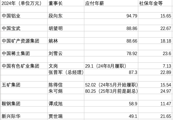 其中,应付年薪最高的是中国铝业集团董事长段向东(94.79万元),其次是中国宝武集团董事长胡望明(88.86万元)。